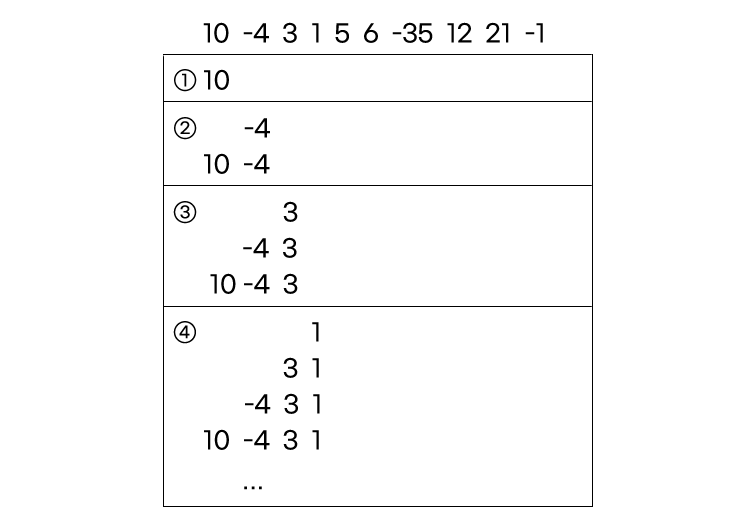 - ๊ฐ ์์ i๋ง๋ค ๊ทธ ์์ ๋ถ๋ถํฉ์ ๊ตฌํ ํ์๋ ์์