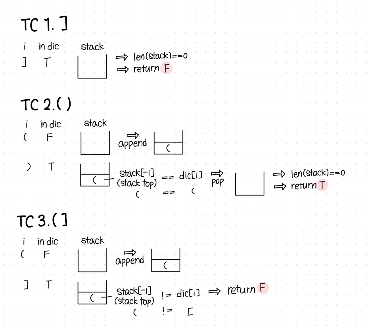 - ์ ๋ ์กฐ๊ฑด์ ๋ชจ๋ ํด๋น๋์ง ์๋๋ค๋ฉด (]์ ๊ฐ์ด pair๊ฐ ๋ง์ง ์๋ ๊ฒฝ์ฐ์ด๋ฏ๋ก return False